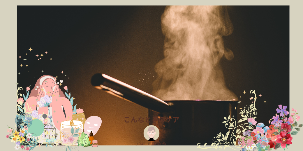 机に沸騰したお湯の入った鍋を置き、椅子に座って行います。繰り返しお湯をあたためなおすため、キッチン付近でのセルフケアをオススメ致します。